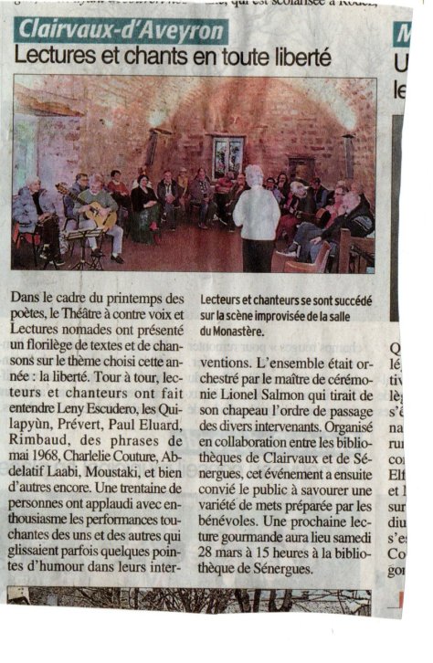 Le Théâtre à Contre Voix et Lectures Nomades ont présenté, dans la salle du Monastère, un florilège de textes et de chansons. Dans le cadre du Printemps des poètes, qui a cette année pour thème la liberté, lecteurs et chanteurs ont tour à tour fait entendre Leny Escudero, les Quilapyùn, Prévert, Paul Éluard, Rimbaud, des phrases de mai 1968, Charlelie Couture, Abdelatif Laabi, Moustaki, et bien d’autres encore. Tout cela devant environ une trentaine de personnes qui a applaudi avec enthousiasme les performances touchantes des intervenants. Où parfois l’humour se glissait ici et là. Tout ça orchestré par le maître de cérémonie Lionel Salmon qui, de son chapeau, par un tirage au sort, appelait les acteurs ou chanteurs.