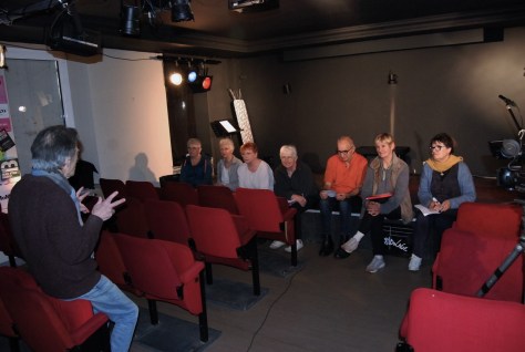 Les comédiens sont des nomades, des voyageurs. Ces comédiens, ceux qui vont investir la scène pour jouer « Karambolage » arrivent là, après un long périple à travers une contrée mystérieuse et se demandent ce pourquoi ils sont là ! « Qu’est-ce qu’on fait là ? » qu’ils disent ! Alors comme rien n’est simple, ils vont en venir non pas aux mains mais à composer des personnages, des situations sous forme de duels où se comprendre, s’entendre, s’aimer, avoir la même vision du monde ne sont pas choses aisées. Dans un kaléidoscope étrange on peut voir défiler une scène du quasi western, une autre où dans une rue deux quidams confrontent leur vision du monde, ce qu’il y a de l’autre côté de la rue, une séparation devant un abri bus, des voyageurs, l’un préfère voyager à pieds et l’autre en avion, des clochardes remuent des souvenirs pas toujours cocasses et cependant s’en rient comme il faut, de drôles de voisins et la crainte d’une araignée au plafond, et un bing bang dingue qui nous interroge sur la création du monde…. Dans une mise en scène « cinéma » avec des intermèdes et un clap cinéma pour tisser le fil rouge, comme une histoire qui se raconte… celle d’un monde absurde et surréaliste parfois .